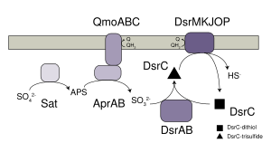 Восстановление мембранным белковым комплексом DsrMKJOP трисульфидной формы DsrC до сульфида (S2−) и дитиольной формы DsrC[5].