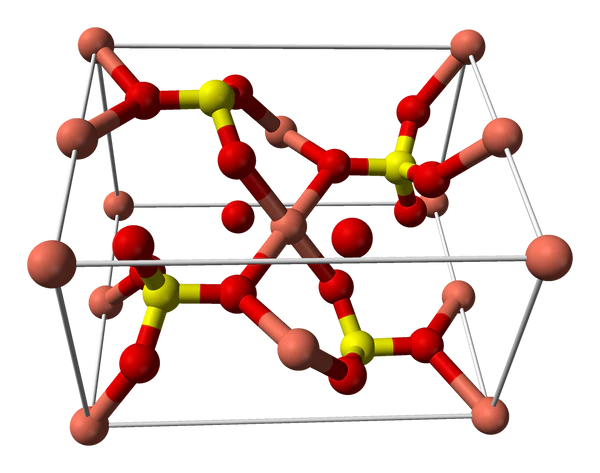 Структура медного купороса приведена на рисунке. Как видно, вокруг иона меди координированы два аниона SO42− по осям и четыре молекулы воды (в плоскости), а пятая молекула воды играет роль мостиков, которые при помощи водородных связей объединяют молекулы воды из плоскости и сульфатную группу.