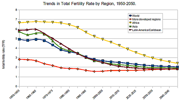 Суммарный коэффициент рождаемости в мире сократился с 4,97 рождений на женщину в первой половине 1950-х годов до 2,47 в 2015−2020 годы[2]. В более развитых стран такой уровень рождаемости был характерен уже в начале 1960-х годах, а к концу века он снизился до 1,57, что покрывается иммиграцией в эти страны из менее развитых стран. Во многих развивающихся странах мира в XXI веке суммарный коэффициент рождаемости упал ниже уровня воспроизводства населения (2,1 рождений на женщину), как следствие общемировой демографической тенденции, приводящей к глобальному демографическому старению населения Земли (кроме Африки южнее Сахары) и вызванного ей уже в ряде стран, как развитых, так и развивающихся, демографического кризиса[3][4][5][6][7].