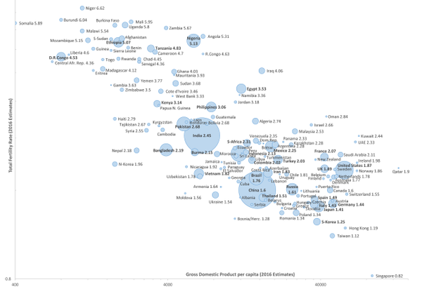 Самый высокий суммарный коэффициент рождаемости в мире — в Нигере — 7,0 (на 2020 год)[8]. Самый низкий — в Южной Корее — 0,71 (на 2021 год)[9].