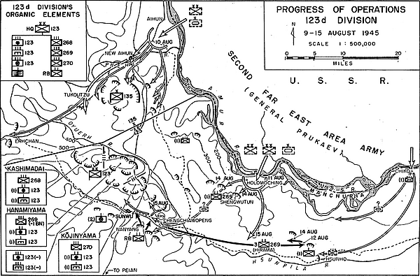 9 августа войска 15-й армии и 5-го отдельного стрелкового корпуса, а 10 августа войска 2-й Краснознамённой армии перешли в наступление. С помощью Амурской военной флотилии, высадившей ряд десантов на занятых японцами берегах (Фуюаньский десант и ряд других) они форсировали Амур и Уссури. Наступление прошло успешно, и уже через три дня советские войска очистили от японской армии весь правый берег Амура. 10—13 августа советские войска прорвали Фуцзиньский, Жаохэйский и Сахалянский укреплёные районы, после чего началось продвижение вглубь Маньчжурии. 15-я армия наступала по обоим берегам Сунгари, но углубившись в горно-таёжную и болотистую местность, практически без дорог, утратила высокий темп наступления. Тогда к наступлению были привлечены корабли Амурской военной флотилии. Они несли на борту усиленные передовые армейские отряды и высаживали десанты, обеспечивали их действия артиллерийской поддержкой, и перебрасывали на усиление передовым отрядам основные силы наступавших войск. При этом, несмотря на уверенное продвижение советских войск, на отдельных участках проходили упорные бои.