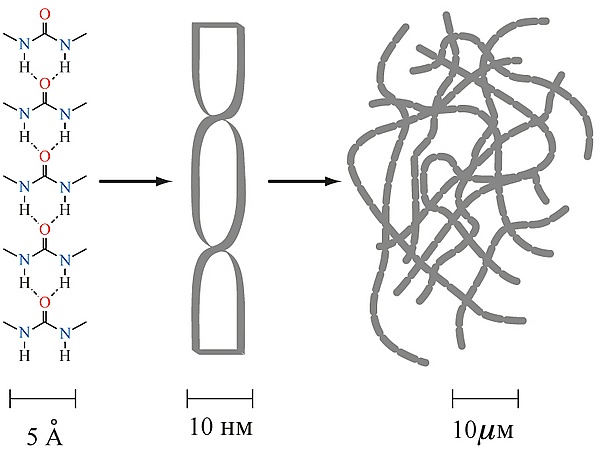 Супрамолекулярные гели получаются из соединений с небольшой молекулярной массой (< 3000). На микроуровне эти гели представляют собой вытянутые волокноподобные структуры, связанные между собой множественными нековалентными взаимодействиями (водородными связями, ван-дер-ваальсовыми взаимодействиями и т. д.) (см. рис.). Явление гелирования органических растворителей некоторыми классами низкомолекулярных органических соединений объясняется тем, что образующаяся трёхмерная супрамолекулярная структура захватывает и иммобилизует окружающие молекулы растворителя как в полости каркаса, так и в результате специфических межмолекулярных взаимодействий.