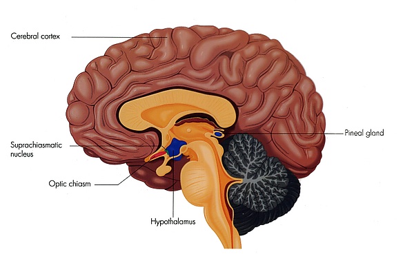 SCN посылает информацию в другие ядра гипоталамуса и шишковидную железу для модуляции температуры тела и выработки таких гормонов, как кортизол и мелатонин.