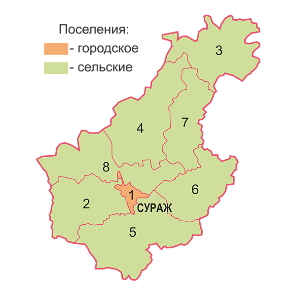 Суражский муниципальный район в рамках муниципального устройства, включает 8 муниципальных образований нижнего уровня, в том числе 1 городское поселение и 7 сельских поселений[20]: