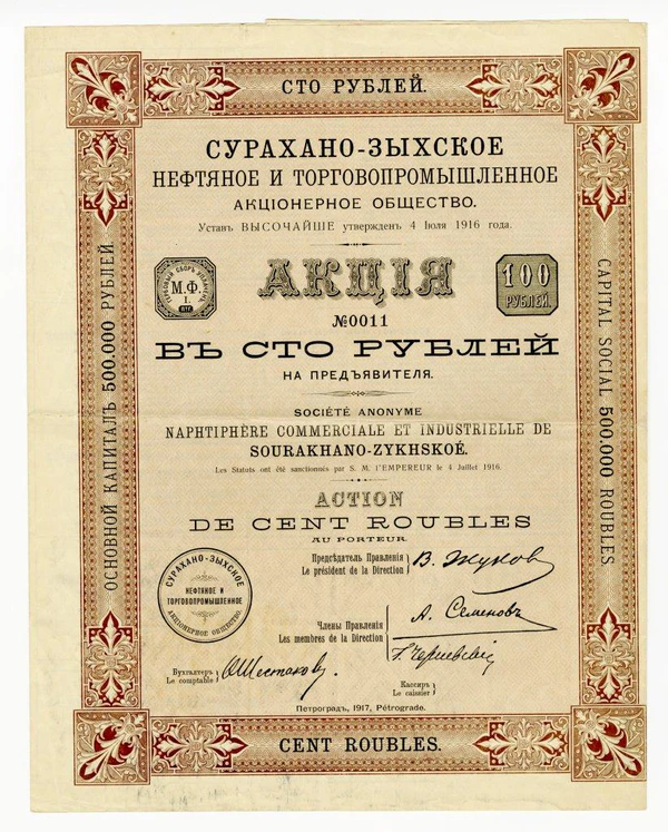 Устав Сурахано-Зыхского нефтяного и торговопромышленного акционерного общества был высочайше утвержден 4 июля 1916 г., а непосредственно к нефтепромыслу компания приступила в переломном для России 1917 г. — году революционных потрясений и начала гражданской войны. «Сурахано-Зыхское» общество осваивало месторождения близ поселков Сураханы и Зых Бакинского нефтегазоносного района, окрестности которых издревле славились обилием нефтяных колодцев. Именно в Сураханах в 1857 г. известным предпринимателем и нефтепромышленником В. А. Кокоревым был построен первый в мире нефтеперегонный завод, на котором одно время в качестве консультанта работал Д. И. Менделеев.