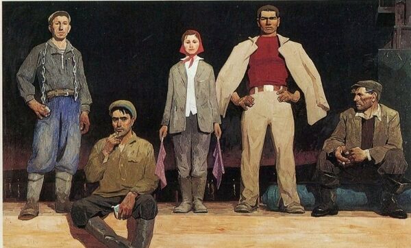 Художники воспевали судьбы современников, их энергию и волю, «героику трудовых будней». Изображения обобщены и лаконичны. Основой выразительности служат большие плоскости цвета и линейные контуры фигур.