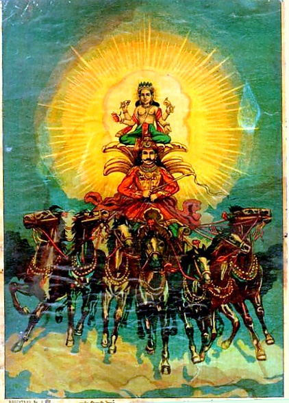 Более того, все главные божества индуизма получили эпитеты Сурьи: «пракаятман» (prakayatman) или самосветящийся, «бхаскара» (bhaskara) или солнечный, святящийся и т. д. В частности, Шива в аспекте Батара-Гуру и Шивы-Сурьи почитается как бог Солнца. Состояние божественности стало описываться световыми характеристиками[10].