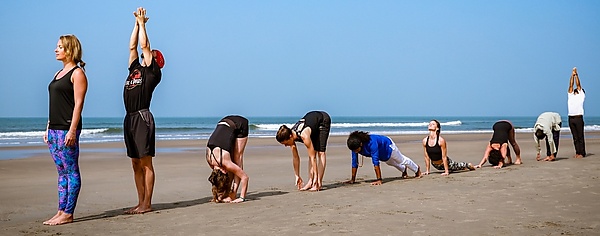 Приветствие солнцу — это последовательность около двенадцати йога асаны соединяются прыжками или растяжками, несколько различающимися между школами. В йоге Айенгара основная последовательность такова. Тадасана, Урдхва хастасана, Уттанасана с поднятой головой, Адхо мукха сванасана (внизу собака), Урдхва мукха сванасана (вверху собака), Чатуранга дандасана Затем переворачиваем последовательность, чтобы вернуться в Тадасану; в последовательность можно вставить другие позы[9].
