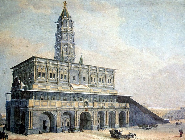 В 1697—1701 годах, когда Пётр I вернулся из Европы, башню реконструировали и выстроили третий ярус[4]. С востока было пристроено крыльцо в два лестничных марша. После окончания строительства здание достигло 64 метров в высоту и 40 метров в ширину. Считается, что архитектура башни была позаимствована у ратуш в Голландии или Германии. Её общий вид должен был напоминать корабль с мачтой: галереи второго яруса образовывали верхнюю палубу, восточная сторона — нос, а западная — корму[6][10][7][8].