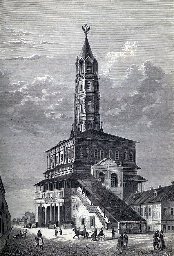 На крутой горе, усыпанной низкими домиками, среди коих изредка лишь проглядывает широкая белая стена какого-нибудь боярского дома, возвышается четвероугольная, сизая, фантастическая громада — Сухарева башня. Она гордо взирает на окрестности, будто знает, что имя Петра начертано на её мшистом челе! Её мрачная физиономия, её гигантские размеры, её решительные формы, всё хранит отпечаток другого века, отпечаток той грозной власти, которой ничто не могло противиться[24].