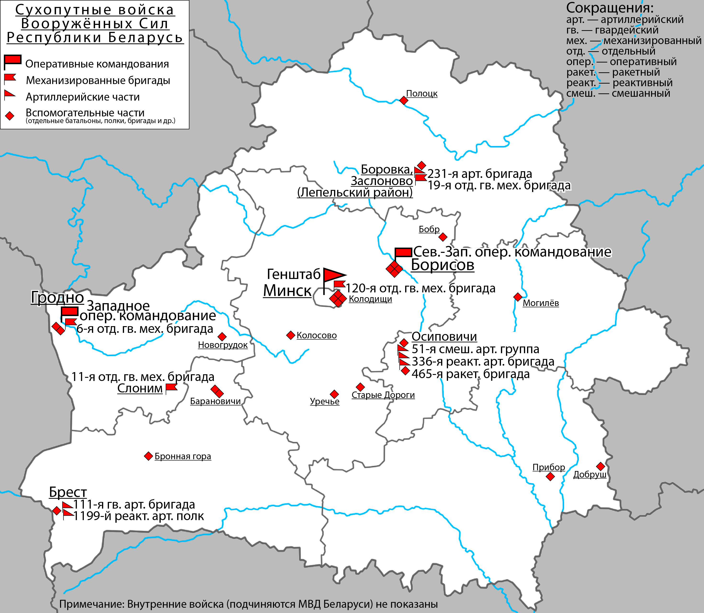 | 11-я отдельная гвардейская механизированная Прикарпатско-Берлинская Краснознамённая, ордена Суворова бригада | г. Слоним | Структура: 2 танковых батальона, 3 мотострелковых батальона, группа артиллерии, зенитный ракетно-артиллерийский дивизион, разведывательный батальон, батальон связи, инженерно-саперный батальон, ремонтно-восстановительный батальон, батальон материального обеспечения, медицинская рота | |
