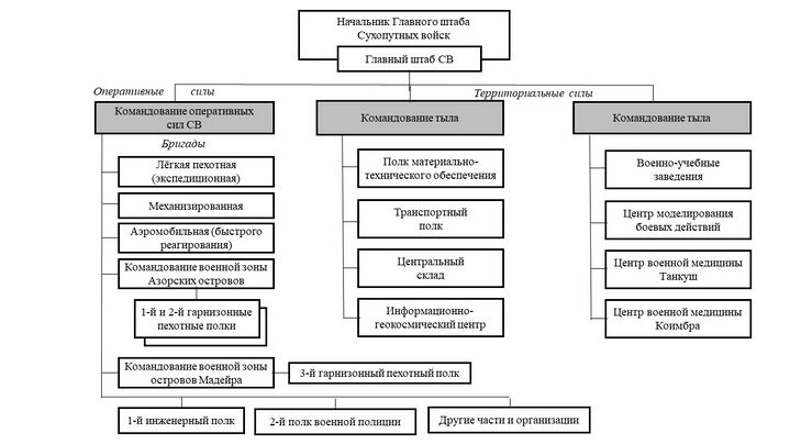 По целевому предназначению современные сухопутные войска Вооружённых сил Португалии подразделяются на[1]: