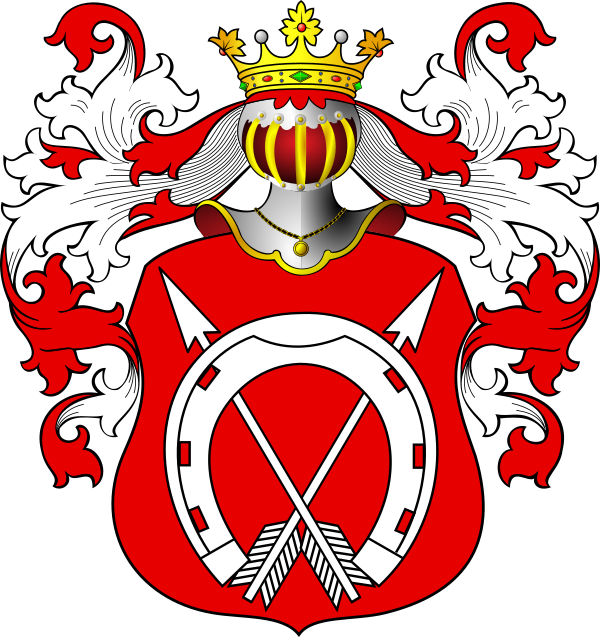 В червленом поле накрест вверх две серебряные стрелы с золотыми наконечниками. Поверх них серебряная подкова концами вниз с черными гвоздями. Над щитом дворянский коронованный шлем. Нашлемник: золотой меч острием вверх, по бокам по золотой шестиконечной звезде. Намет: червленый с серебром[1].