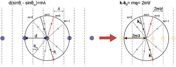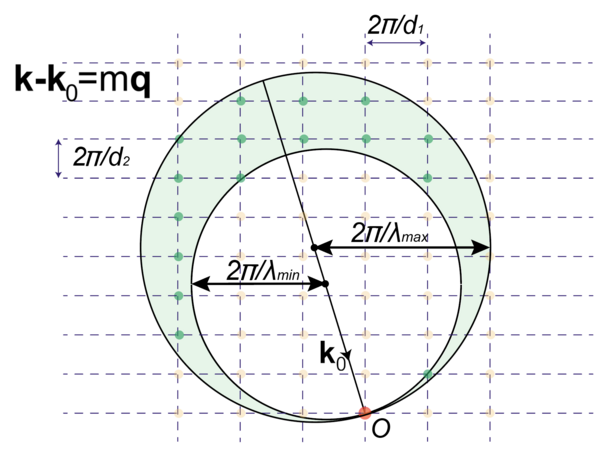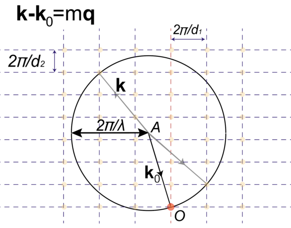 где — вектор обратной решётки. Эти формулы можно проиллюстрировать простым графическим построением, аналогичным иллюстрации направлению на порядки для дифракционной решётки.