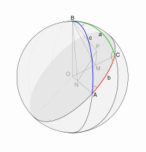 Доказательство проведём с помощью проекций[1]. На рисунке показан сферический треугольник ABC на сфере радиуса R с центром в точке O. BP — перпендикуляр к плоскости большого круга, проходящего через сторону b, BM — перпендикуляр к OC, BN — перпендикуляр к OA. По утверждению, обратному теореме о трёх перпендикулярах, PM — перпендикуляр к OC, PN — перпендикуляр к OA. Заметим, что угол PMB равен π - C, кроме того, ON = R cos c и OM = R cos a. Далее, проецируем ломаную OMPN на прямую, содержащую ON.
