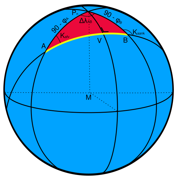 Хотя для решения косоугольных сферических треугольников обычно используются более удобные формулы, с помощью теоремы косинусов выводится важная для геодезии формула длины ортодромии — кратчайшего расстояния между точками на земной поверхности с известными координатами (в предположении сферичности Земли). Обозначим географические широты двух данных точек и , разность долгот — , кратчайшее расстояние между ними обозначим d, длину дуги в 1 градус — a. Тогда формула длины ортодромии[2]: