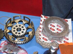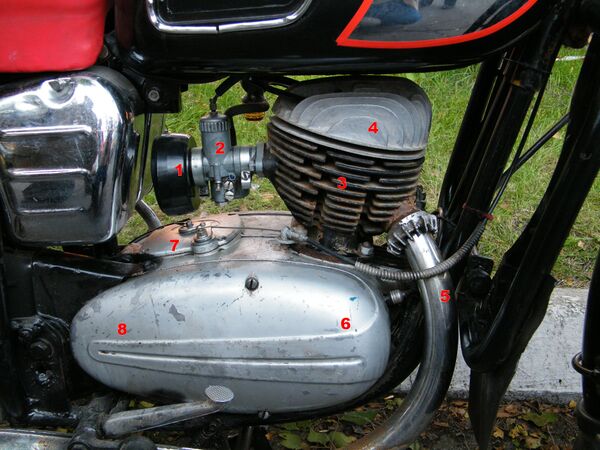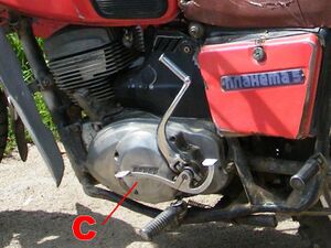 На заднем конце коленвала расположена ведущая (малая) звёздочка, соединённая цепью с ведущим барабаном сцепления. Ведущий барабан свободно вращается на первичном валу коробки передач и является большим (ведомым) звеном моторной передачи; на барабане — храповик кикстартера. Ведомый барабан стоит на том же валу на шлицах. В обоих барабанах собран пакет дисков — ведомых и ведущих, они чередуются и разделяют момент. Ведущие диски связаны с наружным барабаном, ведомые — с внутренним. Последним ставится нажимной диск, который притягивается к барабану пружинами. На ведущих дисках фрикционные накладки из пробки или пластика. Феродо не работает в масляной среде, замасливание автомобильного сцепления — неисправность, пробка или пластмасса в свою очередь для сухого трения не применяются. Плавное включение достигается тем, что пары ведущих и ведомых дисков, разделённые слоем масла, не «схватываются» одновременно.
