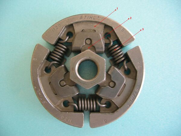 - В бензопилах, бензокосах применяется центробежное сцепление: с ростом оборотов двигателя под действием центробежной силы накладки прижимаются к барабану, приводя во вращение пилу или косу. При снижении оборотов накладки отходят, момент прекрашается.