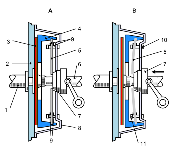 - Фрикционная поверхность маховика (синий цвет, слева)