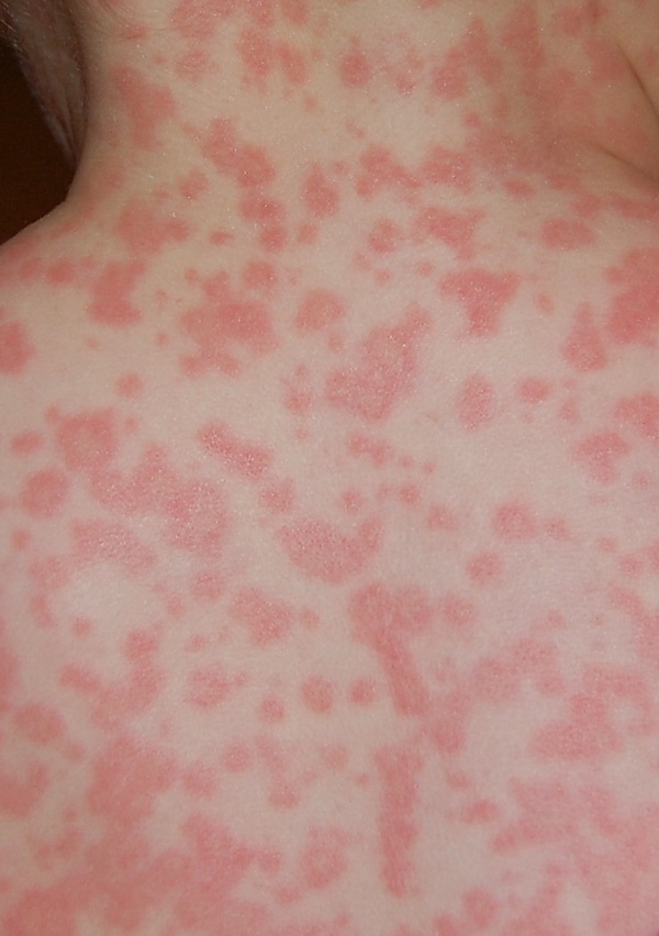 - Волдырь (лат. urtica)[5] элемент без полости, округлых или неправильных очертаний, розового цвета, иногда с белесоватым оттенком в центре, возникает из за отёка сосочкового слоя дермы, существует от нескольких минут до нескольких часов. Сопровождается зудом. Исчезает бесследно.