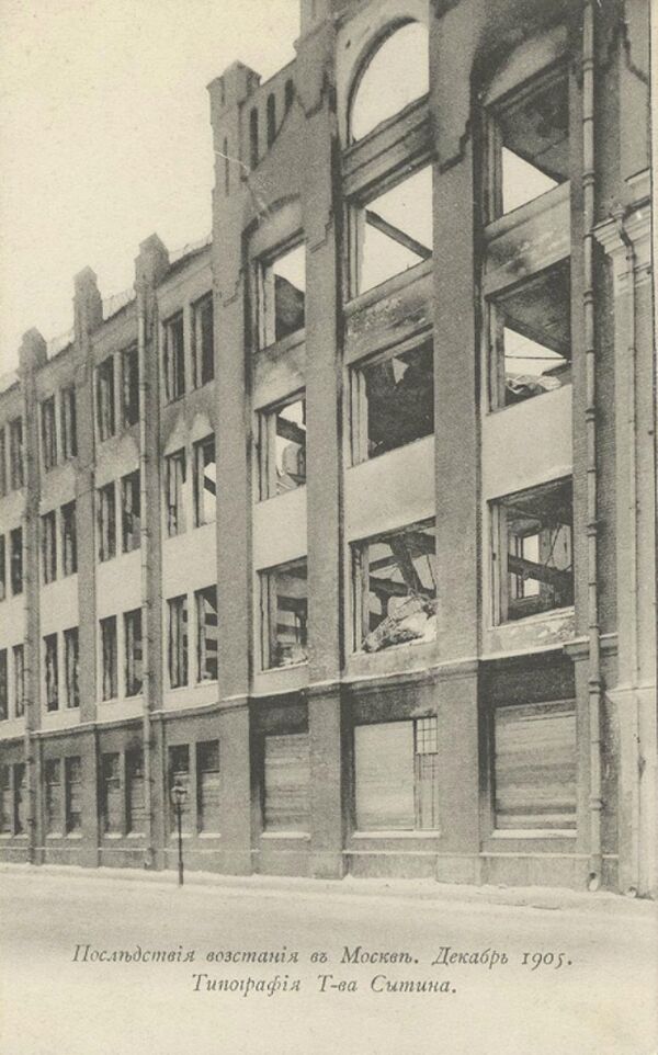 МОСКВА, 12 декабря. Сегодня на рассвете сгорела типография Сытина на Валовой улице. Типография эта представляет огромное роскошное по архитектуре здание, выходившее на три улицы. Со своими машинами она оценивалась в миллион рублей. В типографии забаррикадировались до 600 дружинников, преимущественно рабочих печатного дела, вооружённых револьверами, бомбами и особого рода скорострелами, называемыми ими пулемётами. Чтобы взять вооружённых дружинников, типографию окружили всеми тремя родами оружия. Из типографии стали отстреливаться и бросили три бомбы.