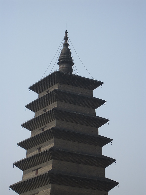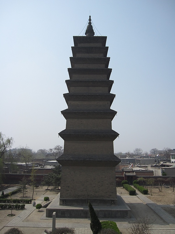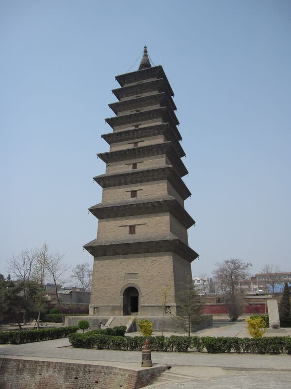 Пагода имеет девять ярусов карнизов и венчающий шпиль, а также множество резных камней, расположенных у основания. Внутри пагоды пусто, лестницы, ведущей к верхним этажам, нет. Стиль карнизов напоминает ряд других пагод империи Тан, таких как Малая и Большая пагоды диких гусей. Возле арочного входа в пагоду расположена массивная каменная черепаха биси, китайское мифическое животное[1]. Левая часть каменной статуи была отколота и пропала, пока не была найдена в 2000 году во время раскопок на соседней улице[1].