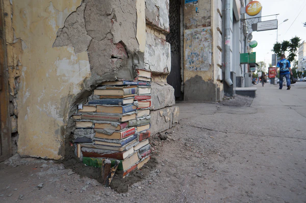 - Усиление контраста, 2013. Стрит-арт. Книги, цемент. Самара. Работа была опубликована в твиттер-аккаунте Banksy (@thereaIbanksy)[133][134][135][136][137][138]