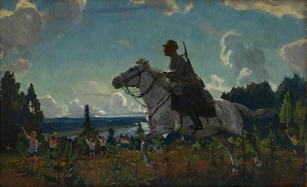 На переднем плане картины изображена поляна, покрытая молодой елью и травой с жёлтыми цветами. Центральное место в композиции занимает красноармеец в зимней гимнастёрке, синих галифе, сапогах и фуражке, скачущий на сером коне справа налево. За его спиной закреплена винтовка, в руках он держит белый пакет. На заднем плане, из глубины поля, за красноармейцем бегут пионеры, размахивающие букетами цветов. По краям картины виднеется лес, вдали — высокие ели, река с противоположным высоким берегом и синяя полоса леса. Над пейзажем простирается голубое небо с кучевыми облаками, края которых освещены солнцем, что придаёт сцене светлую атмосферу. Сюжет отражает характерные черты батального жанра, сочетая динамику движения и символику преемственности поколений.