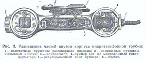 Батарея. В верхней части корпуса, за телефоном, расположена батарея (БАС). Элементы батареи устанавливаются один на другой, в специальное отверстие, которое закрывается навинтованой пластмассовой пробкой. С внутренней стороны пробка имеет спиральную пружину, прижимающую элементы сверху, для улучшения контакта.