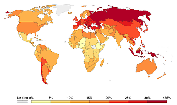 Связанные с курением заболевания развиваются после нескольких десятилетий потребления табака. Поэтому рост смертности наблюдается примерно через 20—30 лет после роста числа курильщиков. Уже в начале XXI века в странах бывшего СССР бо́льшая часть курильщиков выбывала из-за смерти, а не благодаря прекращению курения[45]. К 2020 году около 22 % смертей в России было связано с курением. Предположительно, принятые антитабачные меры помогут сократить эту долю до 13 % к 2035 году[46].