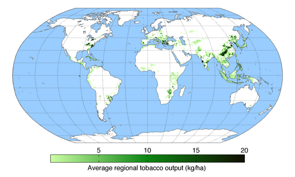 Всего в мире к 2000 году выращиванием табака занимались более чем в 125 странах, общая площадь посевных земель превышала 4 млн гектаров. При этом с 1960-х годов земли, предназначенные для выращивания табака, сократились вдвое в США, Канаде и Мексике, но почти удвоились в Китае, Малави и Танзании. К XXI веку только в Китае располагалась треть от общемировой площади посевных земель. Тем не менее табак выращивали менее чем на одном проценте мировых сельскохозяйственных земель. К 2019-му ежегодно в мире под табачные плантации использовалось 4,3 млн гектаров земли[37][38].