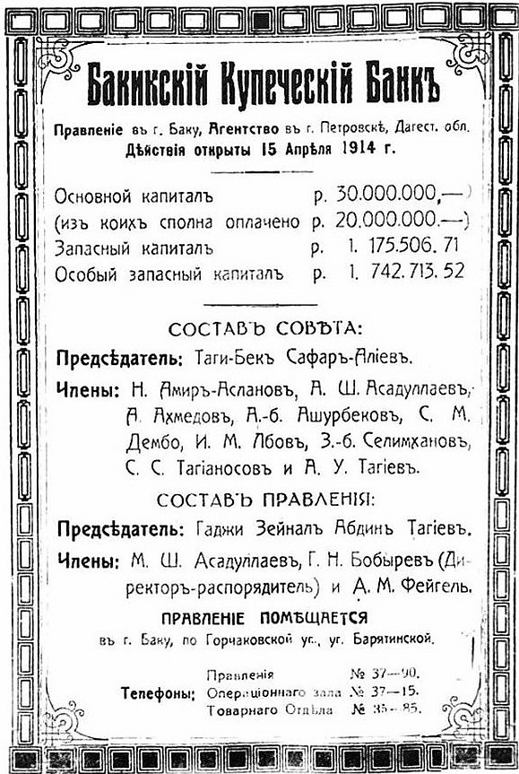 В 1914 году с участием Г. З. Тагиева и М. Нагиева был создан «Купеческий банк» (основной капитал 3 млн рублей)[54].