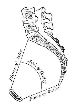 - Прямой диаметр нижней апертуры — между вершиной копчика и нижним краем лобкового симфиза — 9,5 (7,5)