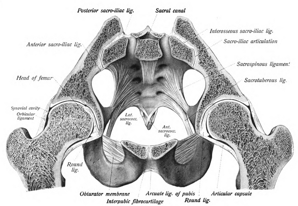 - Лобковый симфиз (лат. symphysis pubica) — соединяет симфизиальные поверхности обеих лобковых костей, между которыми расположен межлобковый диск (discus interpubicus).