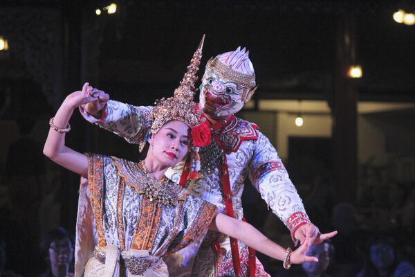 Во время представления актёры театра текст не произносят, его читают за сценой. Представление сопровождается игрой оркестра и пением певцов. Все жесты и движение актёров имеют символическое значение. На сцене играются отрывки из Рамакиен[57]. Вначале труппа королевского театра Кхон выступала на открытом воздухе без декораций. Но к середине XIX века появились декорации, украшения сцены, а представления давались во дворце[58].