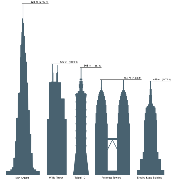 4 января 2010 года Бурдж-Дубай (ОАЭ) открыл двери для посетителей. Церемония открытия небоскреба, напоминающего по форме сталагмит, ознаменовала появление самого высокого здания в мире и самого высокого строения, возведенного человеческими руками. Высота здания до последнего хранилась в секрете, и тайна завесы была приоткрыта лишь в день открытия. Поначалу считалось, что высота небоскреба 822 метра, что на 310 метров выше «Тайбэй 101». Кроме того, если раньше самым высоким в мире строением считалась телебашня в г. Бланшар, Северная Дакота, высотой 628 метров, то «Бурдж Дубай» побил и этот рекорд[15]. Вскоре стала известна точная высота Бурдж Дубай, она составила 828 м[16].