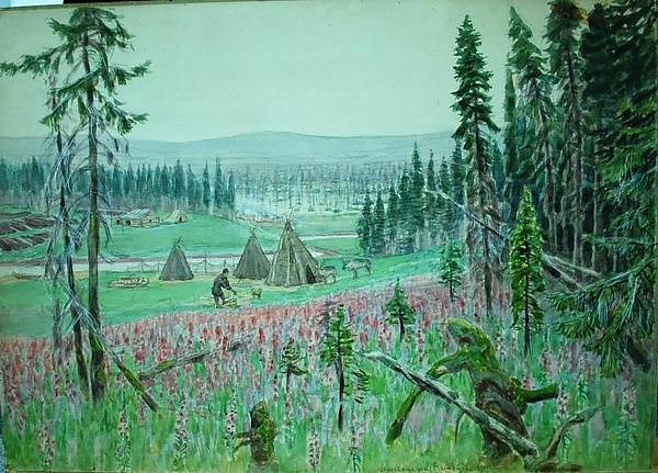 На первом плане картины изображены низкие молодые сосны и коряги, по краям располагаются группы хвойных деревьев. Пологий склон второго плана покрыт бледно-розовыми цветами иван-чая. В центре композиции, в низине, находятся три остроконечных юрты, рядом с которыми стоят два оленя, собака и мужчина. За юртами извивается узкая речка, противоположный берег которой покрыт зелёной травой. На пригорке расположены два деревянных строения, а левее от них рядами разложены брёвна. За постройками виднеется полоса леса, далее простирается тайга, а на горизонте различимы пологие склоны бледно-голубых гор. Небо изображено без облаков, цветовая гамма картины выдержана в зеленовато-серых тонах.