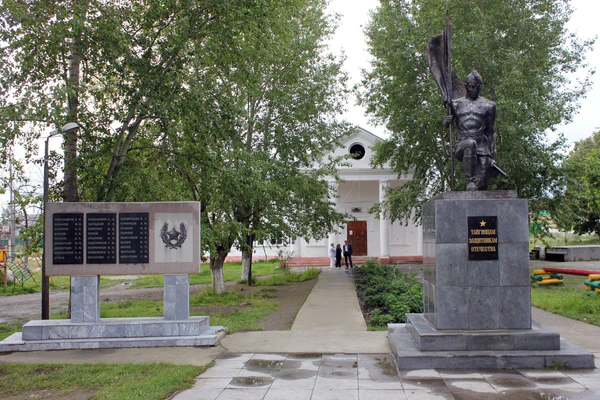 Памятник защитникам Отечества, изображающий солдата, на тумбах указщаны имена погибших тайгинцев, во время Великой Отечественной войны.