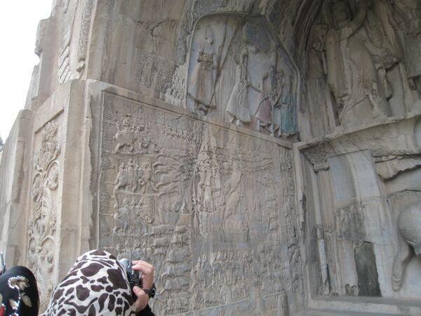 Рельеф внутри большой арки поделён на две части: на верхней изображены три фигуры. Считается, что это Хосров II (Хосров Парвиз) в окружении Ахуры Мазды и Анахиты[7]. Некоторые исследователи считают, что на рельефе изображены не Ахура Мазда и Анахита, а простые священник и жрица. В нижней части рельефа изображён персидский воин на коне. Предполагается, что это также Хосров Парвиз на своём любимом коне Шабдизе. И лошадь, и всадник изображены в полной боевой броне.
