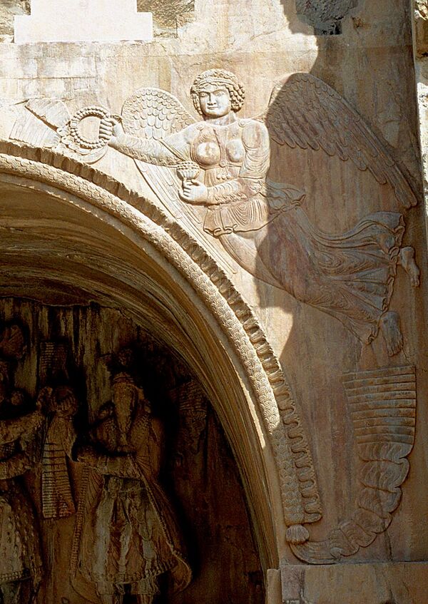 На передней части арки вырезаны узоры, изображающие древо жизни или священное дерево. С двух сторон над аркой изображены две крылатые женщины.