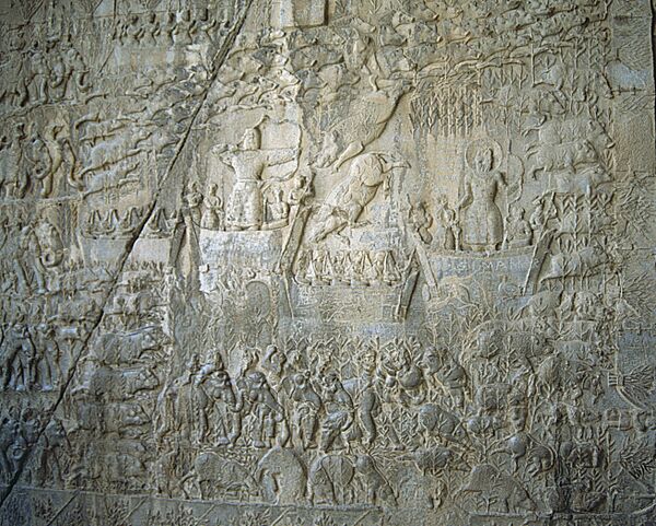 На одной стене изображена охота на кабанов, на другой в этом же стиле высечена охота правителя на оленя. Пять слонов преследуют бегущих кабанов. Шах стоит с луком и стрелой в руках, окруженный женщинами-музыкантами. На другой стене в лодке плывут две арфистки, а правитель уже убил двух крупных кабанов. В следующей лодке изображен шах с опущенным луком — охота закончилась[8].
