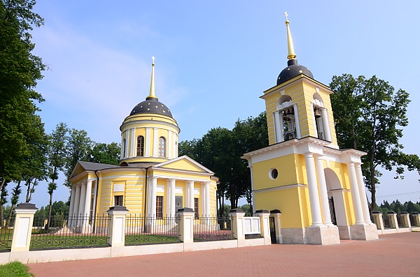 В 1795 году на средства графа Владимира Григорьевича Орлова в Талеже на высоком склоне оврага был построен храм Рождества Богородицы[7]. Руководил воплощением этого проекта в жизнь крепостной архитектор графа Иван Бабакин, скорее всего, по проекту московского архитектора Е. С. Назарова. Площадь храма была равна 576 квадратным метрам. Кирпичное с белокаменным декором здание вместе с утраченной металлической оградой и колокольней образовали небольшой ансамбль в стиле зрелого классицизма. Храм с портиками тосканского ордена принадлежит к типу центрических построек. Четыре пилона несут мощный световой барабан центральной ротонды, вписанной в крестчатое основание, усложненное угловыми округленными выступами. Ветви креста перекрыты цилиндрическими сводами, ротонда — полусферическим куполом. Фасады храма обработаны рустом, барабан расчленён спаренными пилястрами. Стены барабана опускаются до самого пола, образуя небольшое помещение — центральную часть храма.[8]