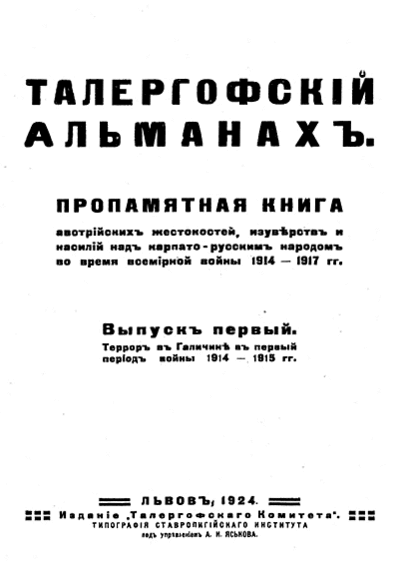 - Талергофскій альманахъ. Пропамятная книга австрійскихъ жестокостей, изуверстствъ и насилий надъ карпато-русскимъ народомъ во время Всемірной войны 1914−1917 гг.. — Львовъ: Изданіе «Талергофскаго Комитета». 1924−1932. — Вып. 1−4. (Все выпуски).