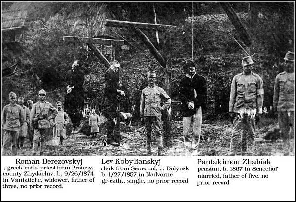 Для запугивания людей, в доказательство своей силы тюремные власти тут и там по всей талергофской площади повбивали столбы, на которых довольно часто висели в невысказанных мучениях и без того люто потрепанные мученики.