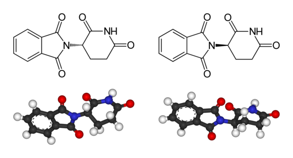 Молекула талидомида может существовать в виде двух оптических изомеров — право- и левовращающего[22]. Один из них обеспечивает терапевтический эффект препарата, в то время как второй является причиной его тератогенного воздействия. Тератогенный изомер не даёт расти кровеносным сосудам плода, нужным для его быстро размножающихся клеток[23]. Этот изомер вклинивается в клеточную ДНК на участках, богатых G-C связями, и препятствует нормальному процессу репликации ДНК, необходимому для деления клеток и развития зародыша.