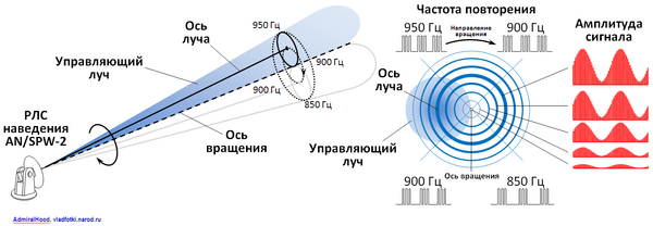 Для разного положения ракеты в зоне действия направляющего луча картина принимаемого сигнала различна. В общем случае амплитуда принимаемых импульсов меняется синусоидально. Максимальная величина импульсов также зависит от положения ракеты. Если ракета находится на окружности, по которой сканирует пространство ось луча, эта величина максимальна. Чем ближе расположена ракета к оси вращения луча, тем эта величина меньше. Таким образом, система управления ракеты получает от РЛС наведения[6]: