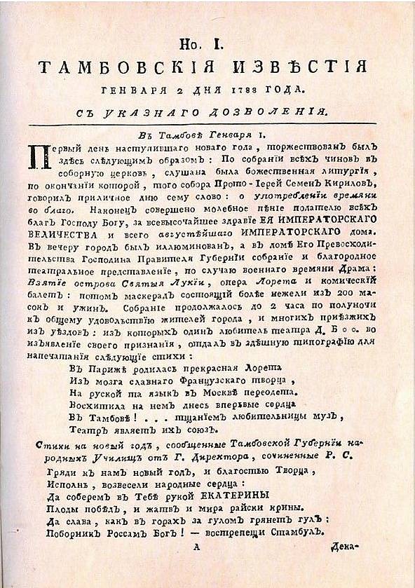 4 января 1788 года Г. Р. Державин официально уведомил генерал-губернатора рязанского и тамбовского наместничеств И. В. Гудовича об открытии вольной российской типографии. Очевидно, что по тем временам подобное в глухой провинции было делом неслыханным.
