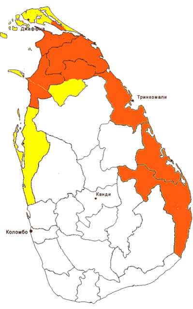 Территория, на которую претендовал Тамил-Илам, на карте Шри-Ланки (зелёным) |