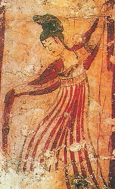 , написан на гадальных костях, и представляет собой танцора, держащего в руках бычьи хвосты[1]. Некоторые современные китайские танцы, такие как танцы с длинными рукавами, были записаны в самых ранних периодах, как минимум в начале династии Чжоу. Наиболее важные танцы раннего периода были ритуальными и обрядовыми — яюе, которые исполнялись до династии Цин, но на текущий день они сохранились только как часть Конфуцианских церемоний.