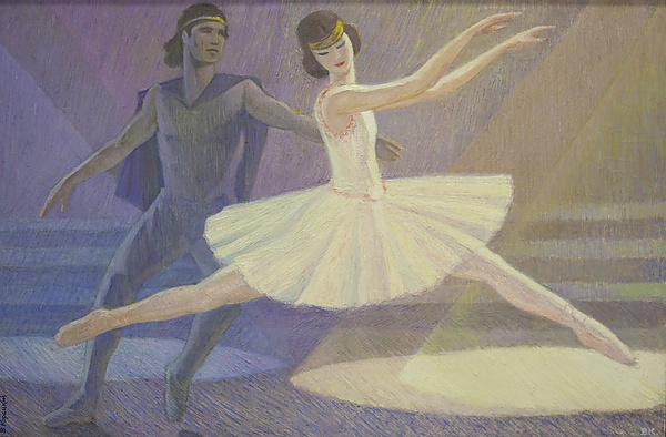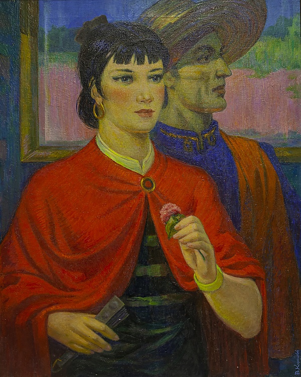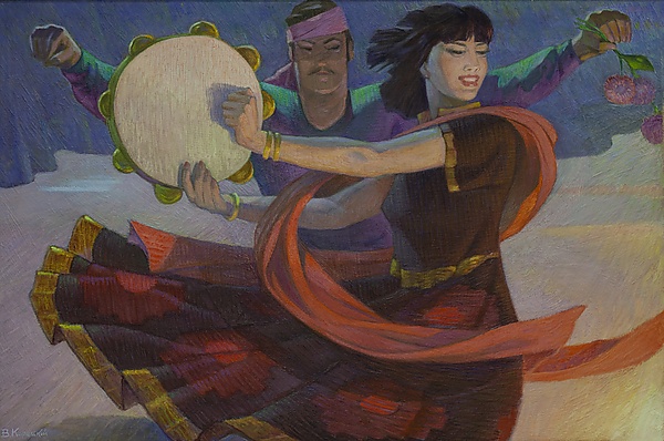 На первом плане этюда изображена танцующая пара, типичная для бытовой сценки. Девушка одета в красно-коричневое платье с жёлтыми полосами на поясе, воротнике, рукавах и по подолу широкой юбки. В её вытянутых налево руках находится светлый бубен, а через левое плечо перекинута светлая узкая шаль, концы которой образуют овал на фоне развевающейся юбки и выделяются на фоне справа внизу. Лицо девушки повернуто направо, глаза прикрыты, на лице заметна улыбка. На втором плане изображён мужчина с азиатскими чертами лица, короткими усами и косо завязанной розоватой повязкой на лбу. Он стоит позади девушки, широко раскинув руки; по верхам длинных рукавов его одежды проходит ярко-зелёная полоса. В левой руке мужчина держит три розовых цветка с опущенными вниз головками.